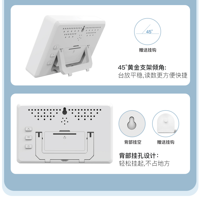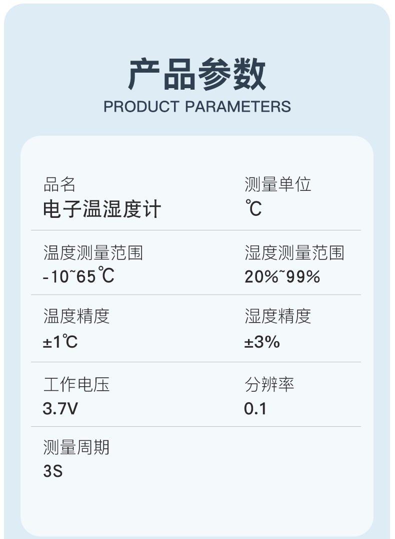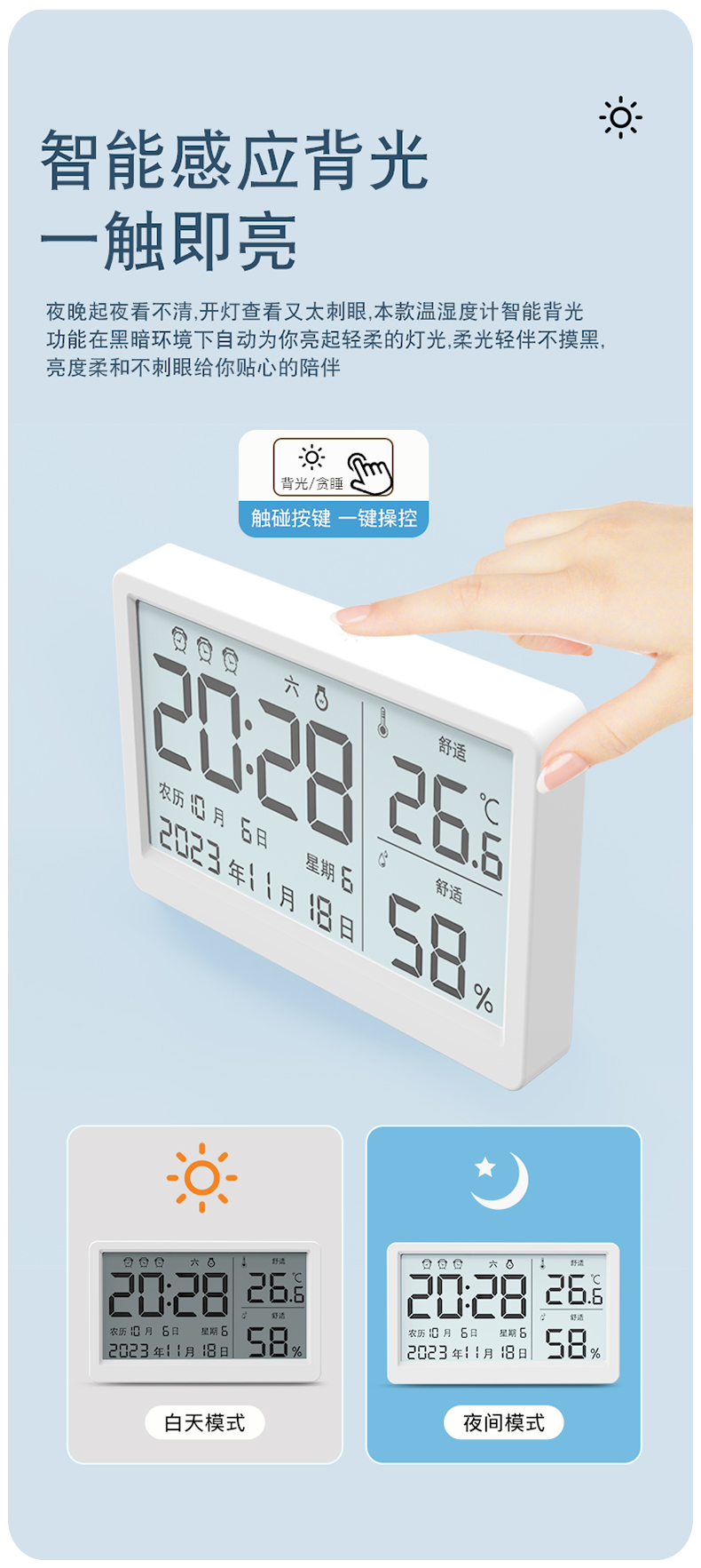 产品功能: 监测:温度、湿度、闹钟、万年历、阳历、星期