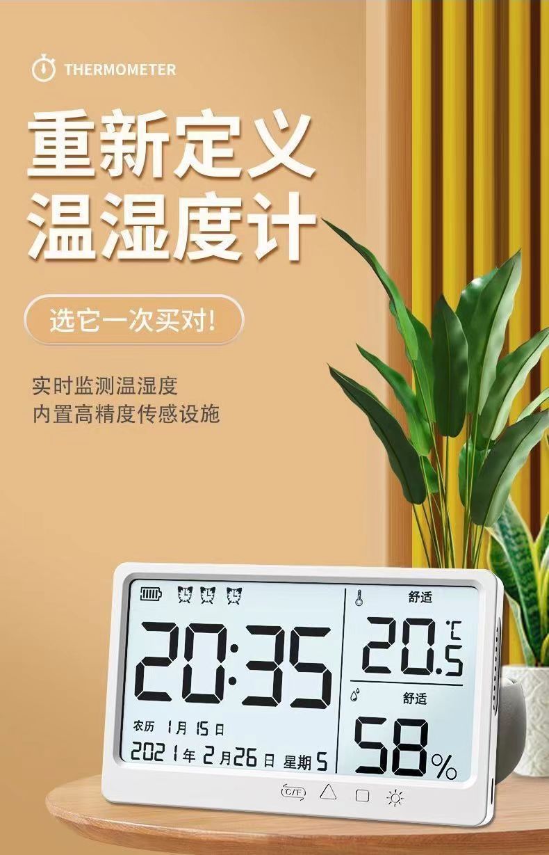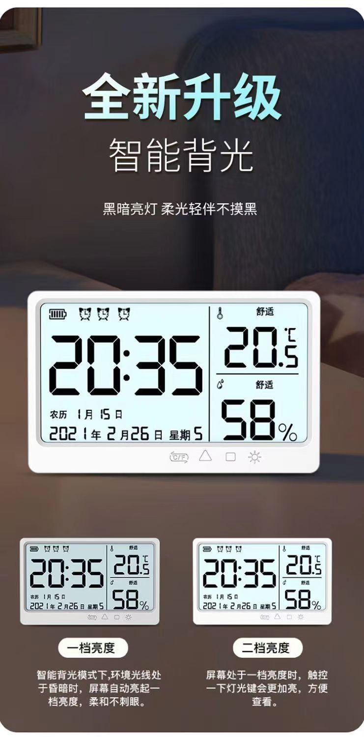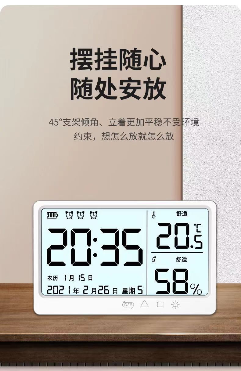 大屏幕家用电子温湿度计高精准度带闹钟背光温