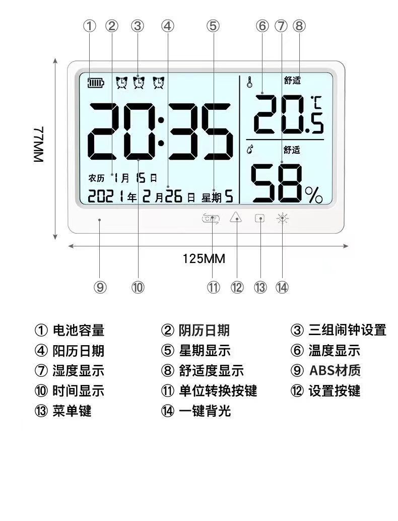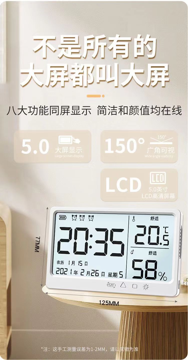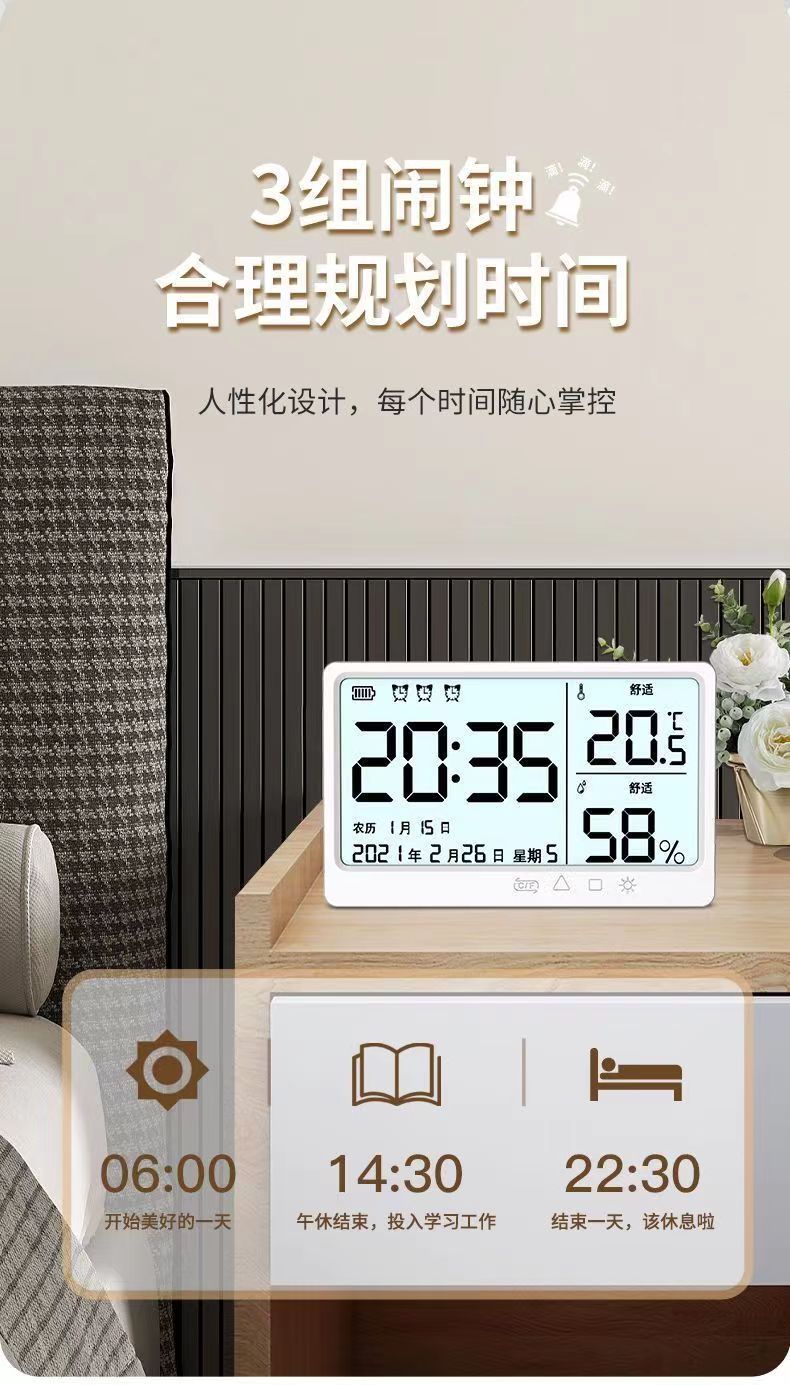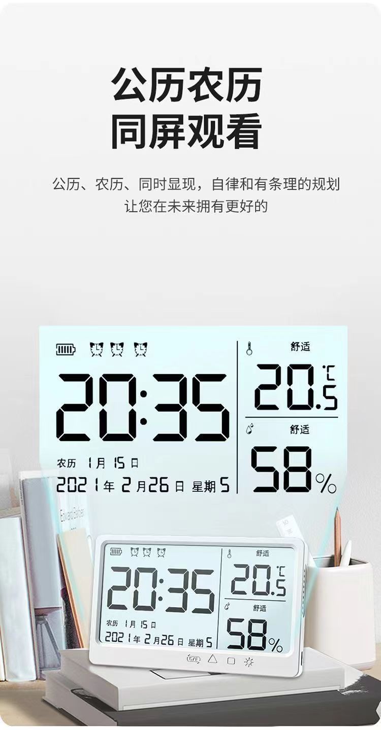 大屏幕家用电子温湿度计高精准度带闹钟背光温