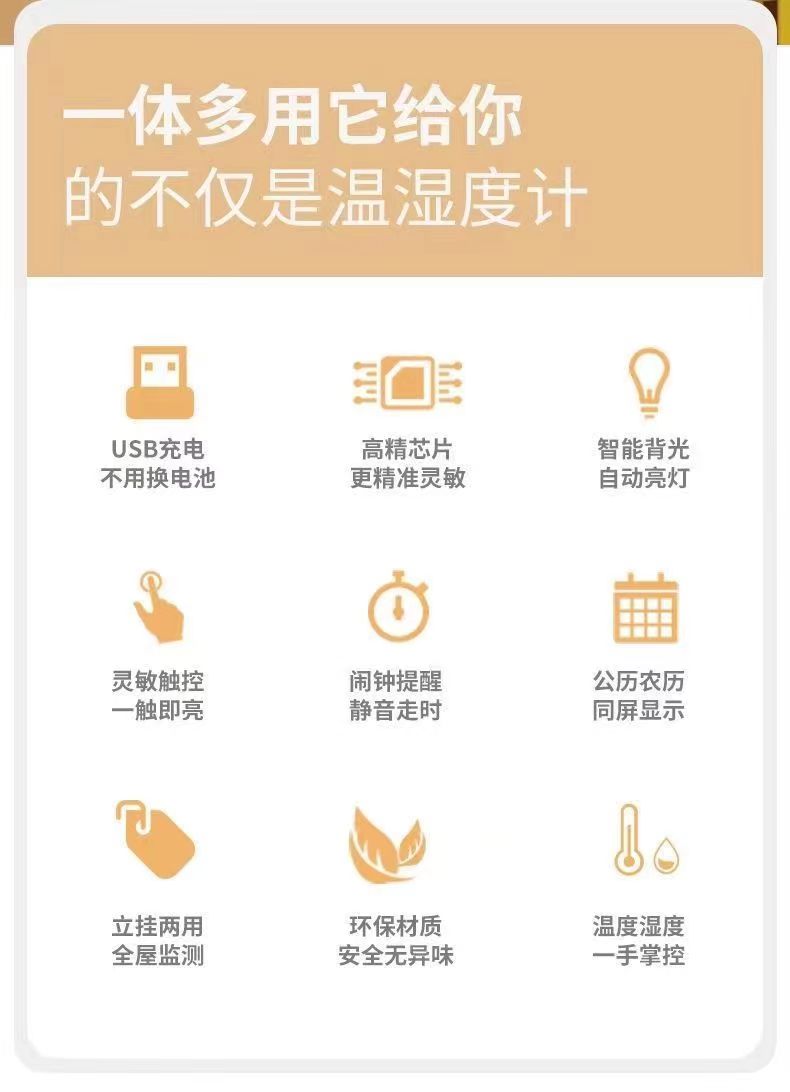 产品功能: 监测:温度、湿度、 闹钟、万年历、 阳历、星期