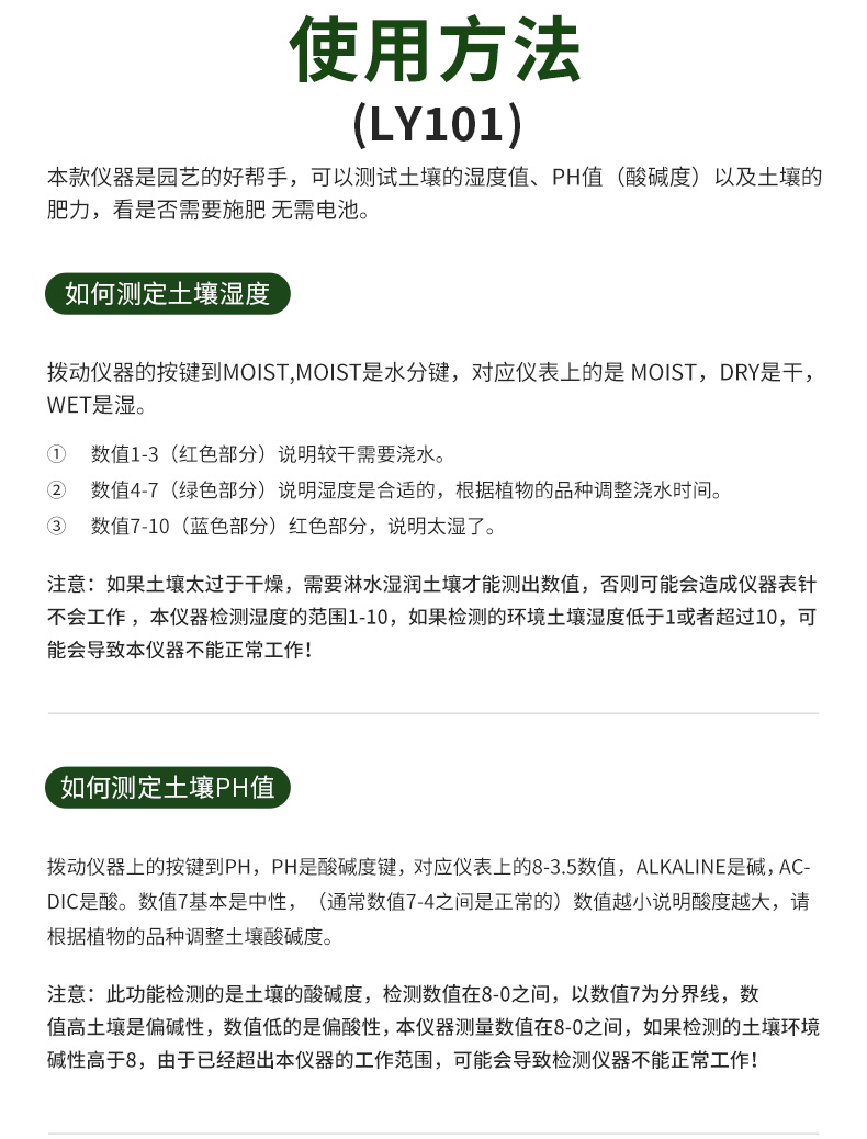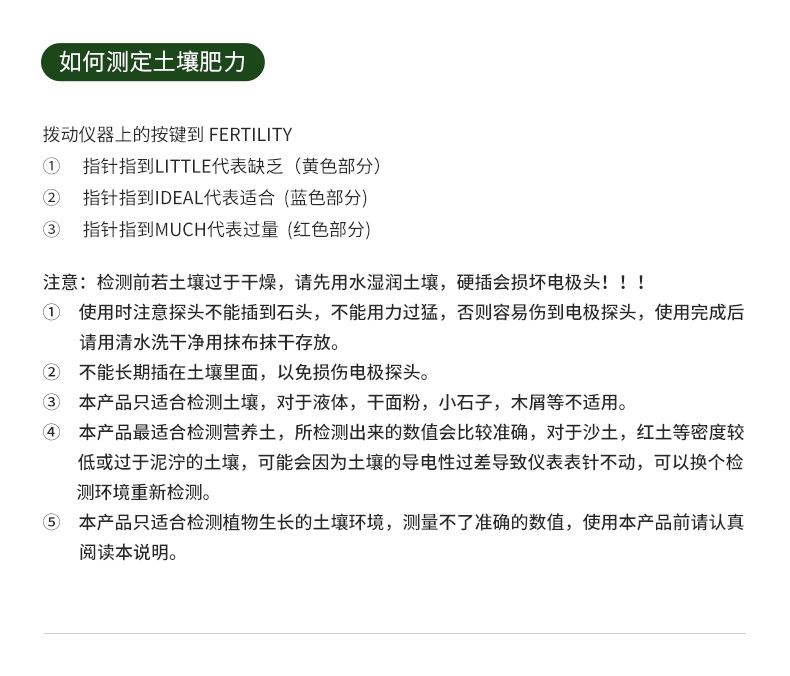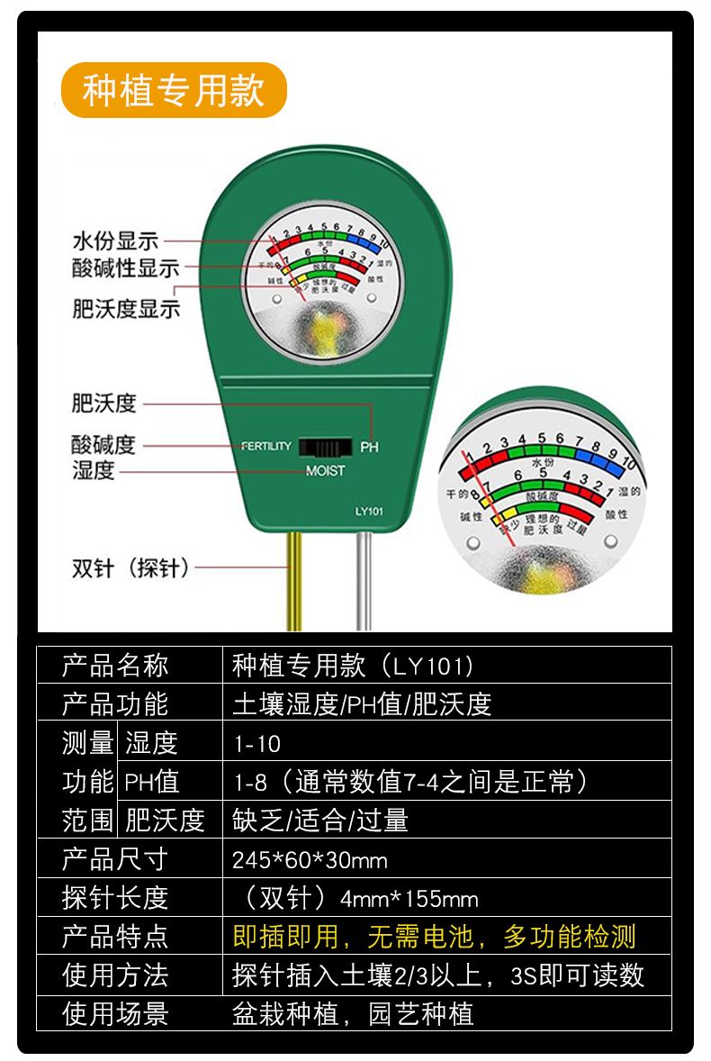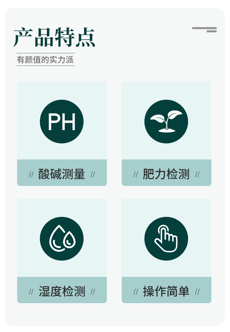 产品功能: 检测:土壤酸碱度PH、肥沃度、湿度