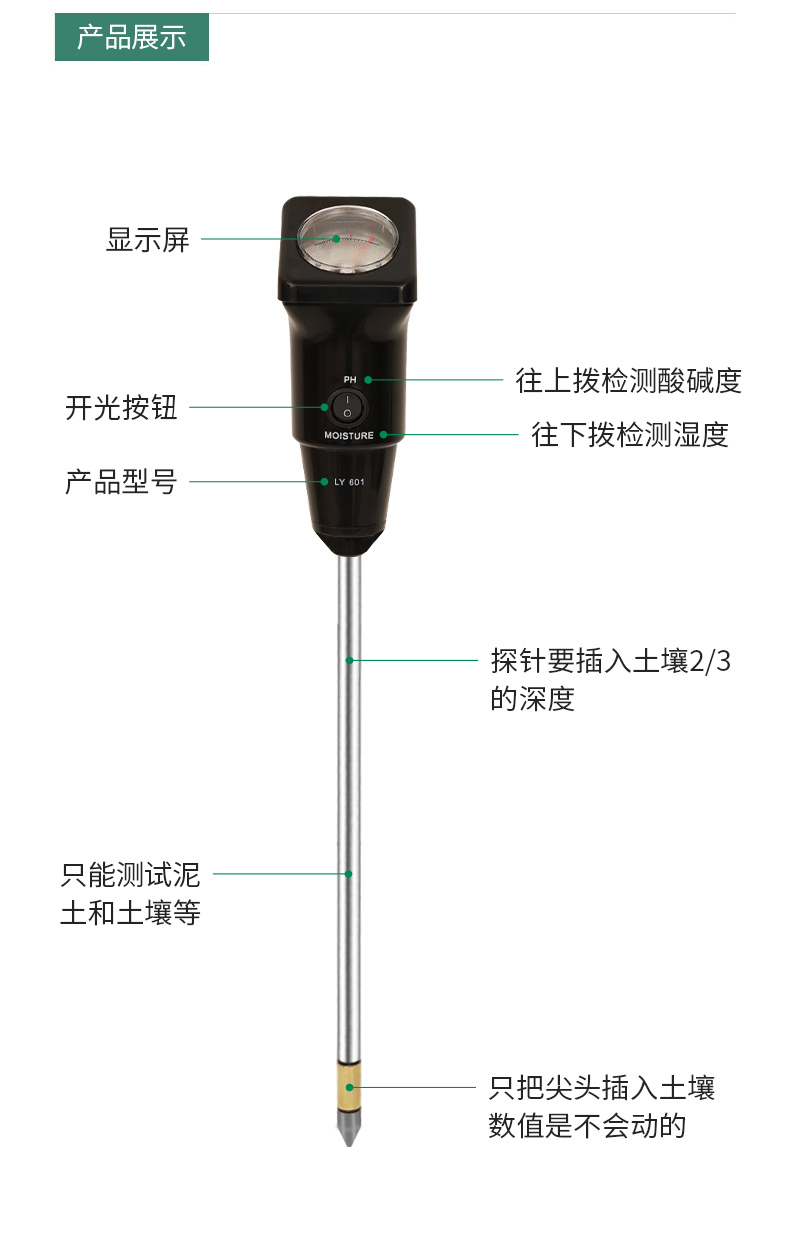 产品功能: 检测:土壤酸碱度PH、盐碱度EC、温度、湿度值